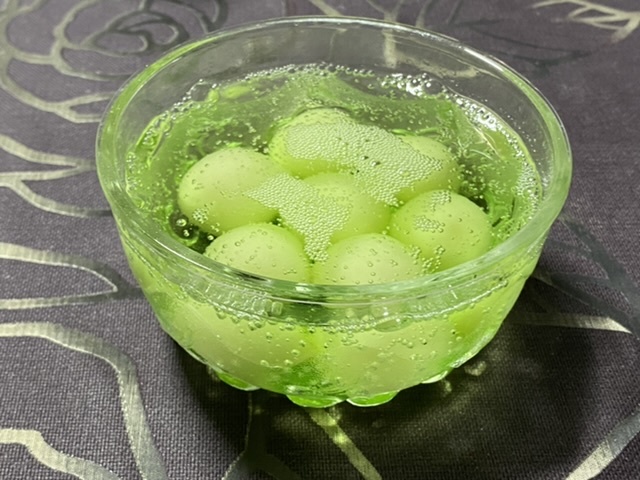 因みに2粒試しに丸める段階でメロンシロップを混ぜてみたんだけど、色は緑にならなかった(少しグラデーションがついたくらい?)し、味も普通の餅だった。